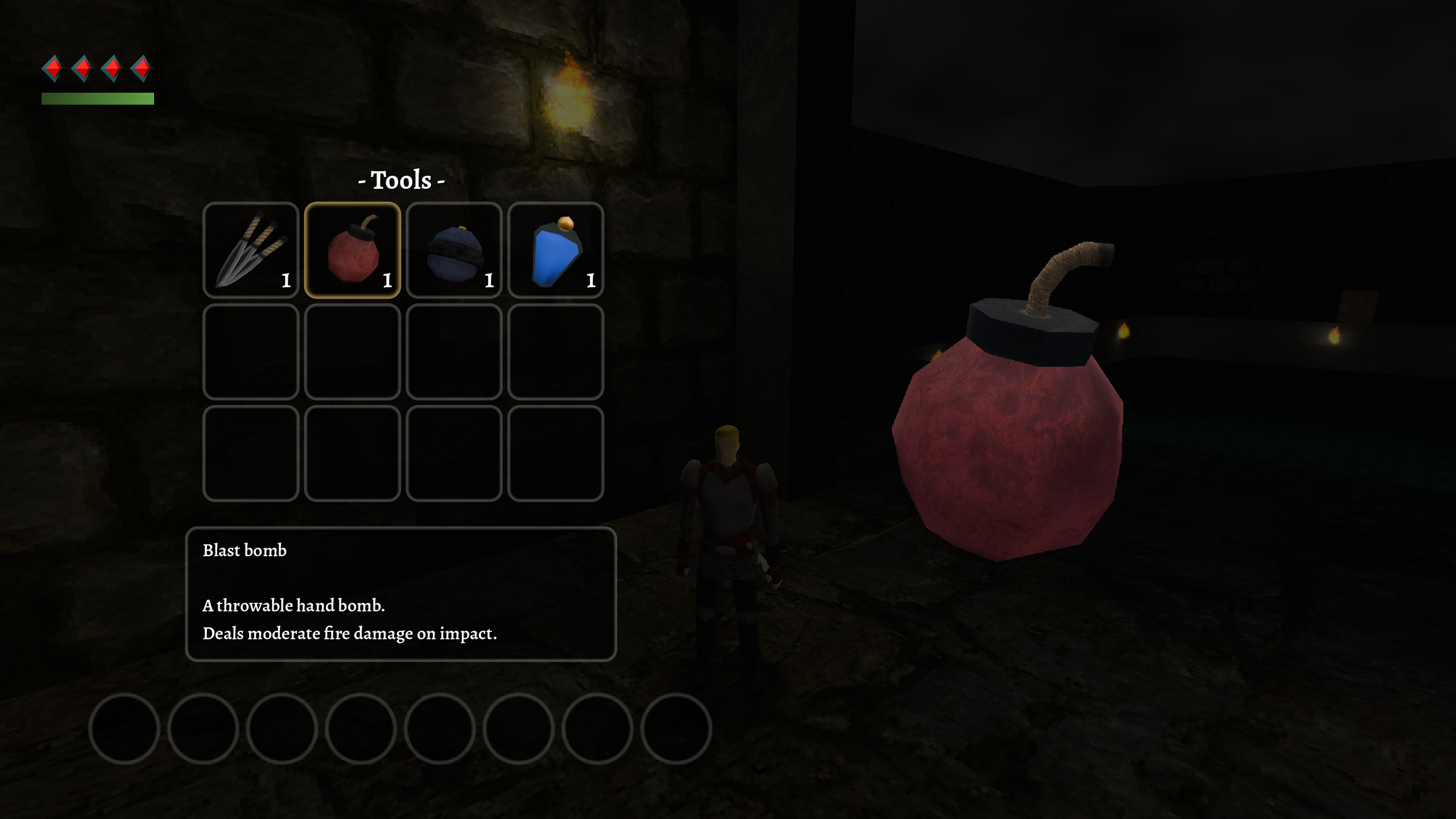I'm implementing multiple kinds of tools, some to deal damage, others to buff you up or debuff your enemies. Some used in place, and others are able to be thrown wherever you want! Have a peek at them in the screenshots below:
